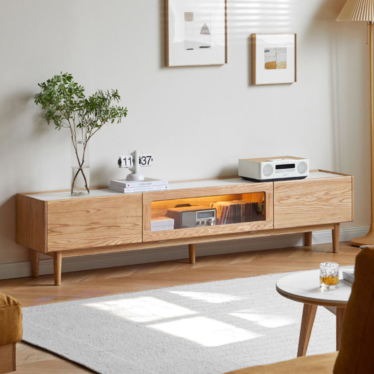Create a stylish dry pantry or coffee corner without renovation. This solid wood sideboard adds height, ambient lighting, and practical storage to small Singapore homes.