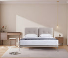 The Serene Bedframe redefines bedroom luxury with its soft, upholstered design in a calming beige tone. Featuring a plush, tufted headboard split into two symmetrical panels, it provides both comfort and contemporary style. The low-profile base, supported by sleek metallic legs, ensures stability while maintaining an airy, minimalist aesthetic. Perfect for creating a serene retreat in any bedroom.