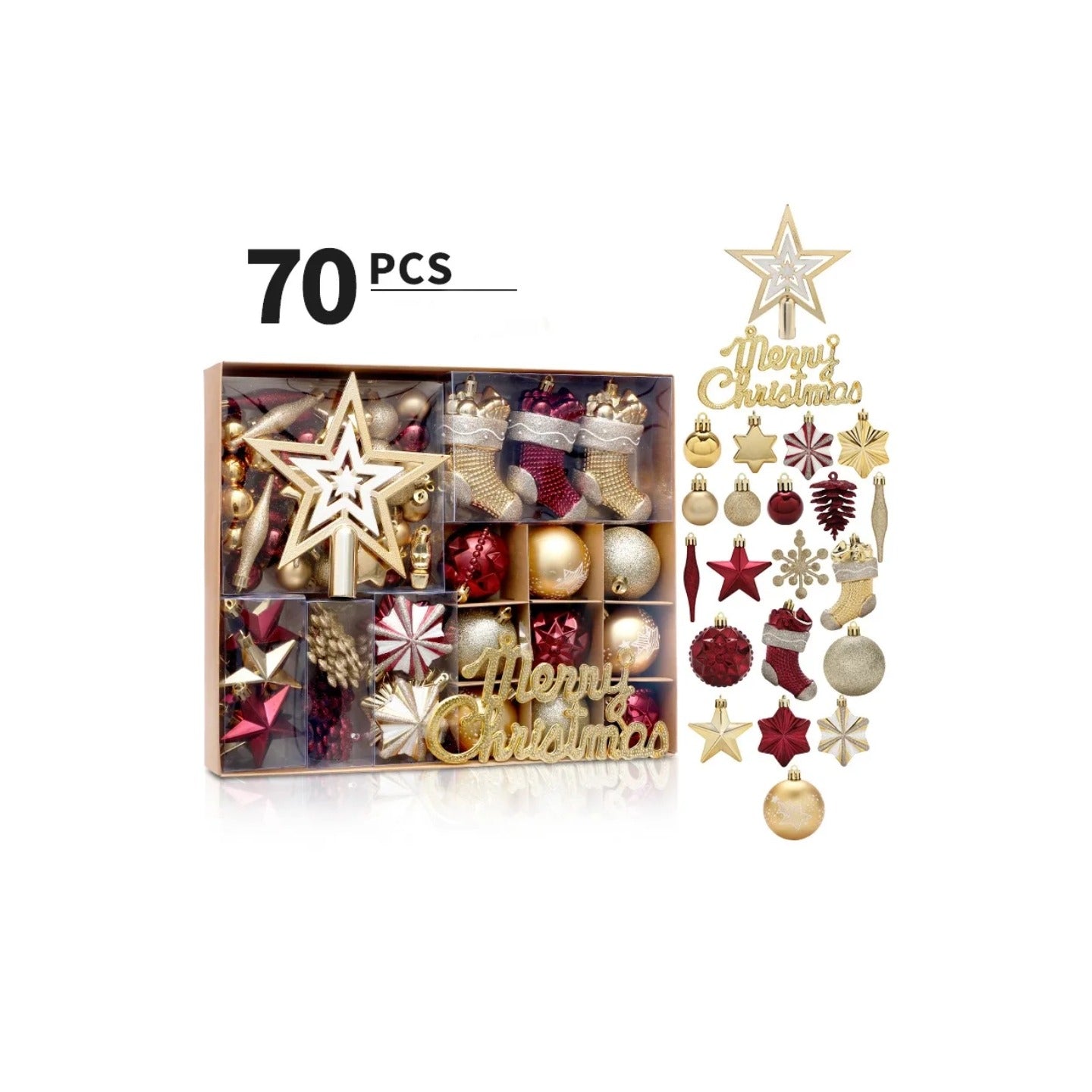 Complete 70-Piece Set: Includes baubles, stars, gift boxes, stockings, and “Merry Christmas” accents for a fully decorated tree.