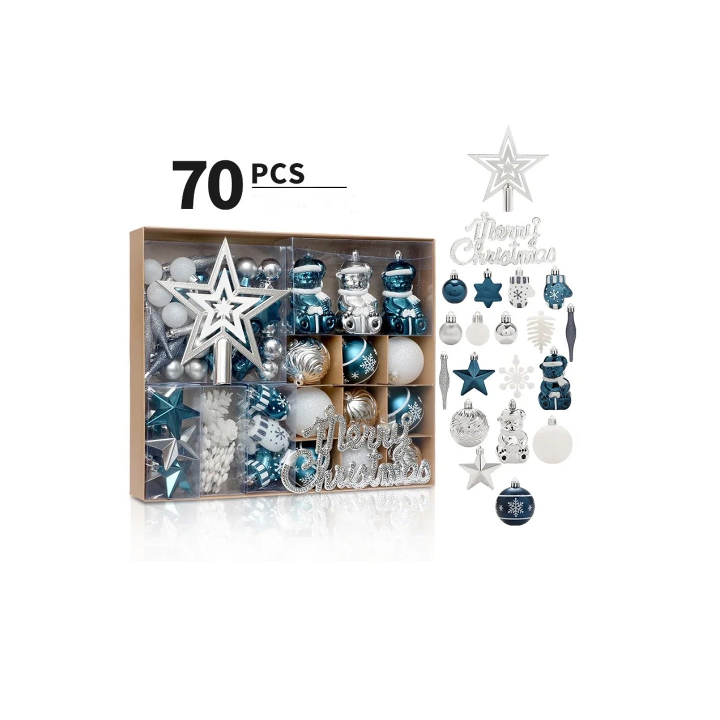Complete 70-Piece Set: Includes baubles, stars, snowflakes, gift boxes, and “Merry Christmas” accents for a fully styled tree.