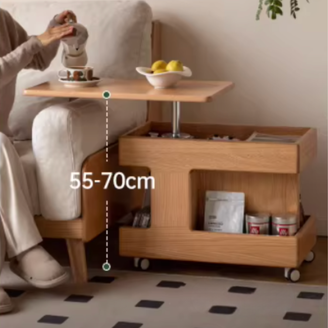 The Enzo Height Adjustable Rotating Side Table is a multifunctional piece designed for both style and practicality. Crafted from premium cherry wood, it features a height-adjustable top and ample storage, making it perfect as a nightstand, side table, or compact work desk.