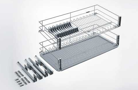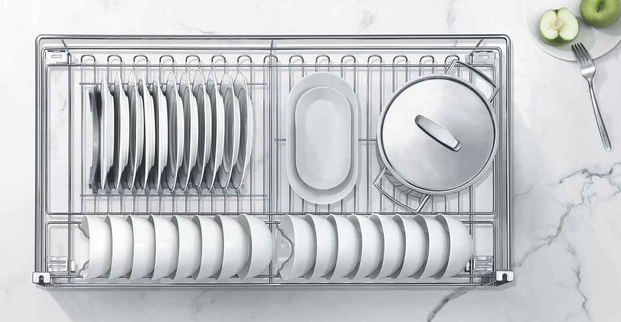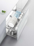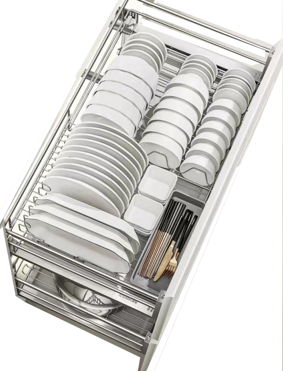 The M Series two-drawer pull-out basket features a spacious design with smart partitions for effortless organization. It neatly stores a variety of bowls, plates, and tableware, ensuring each item has its own dedicated space and keeping your kitchen essentials clear and easy to access at a glance.