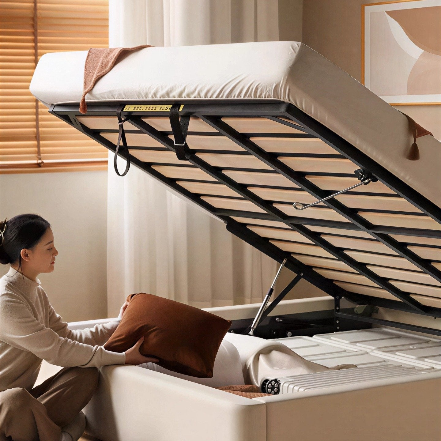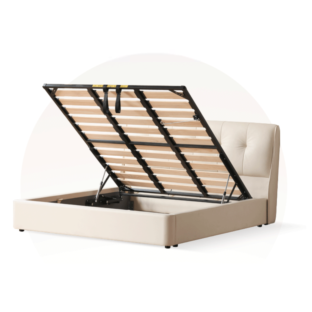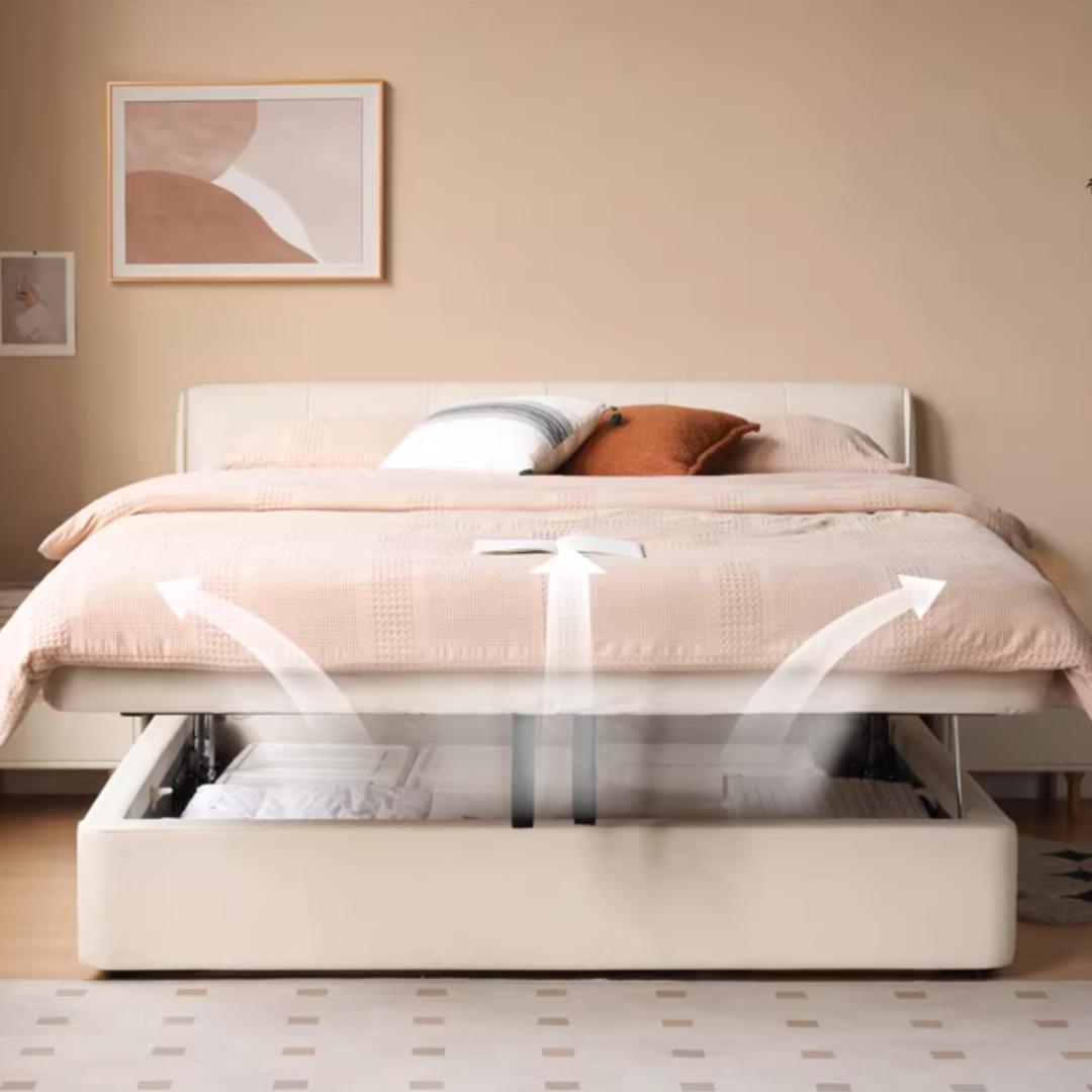 Lift-Up Storage Design: Smooth hydraulic lift system reveals spacious hidden storage, perfect for bedding, seasonal items, and everyday essentials.