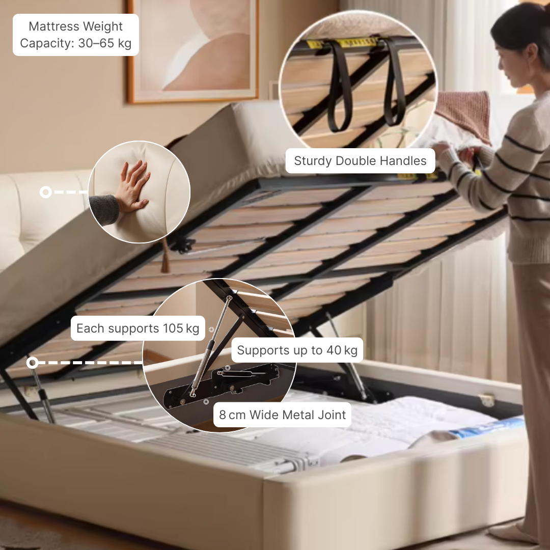 • Lift-Up Storage Design: Smooth hydraulic lift system reveals spacious hidden storage, perfect for bedding, seasonal items, and everyday essentials.