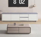 The Lyric TV Console showcases a sleek and minimalist design with a smooth cream finish and contrasting black top. Featuring a combination of cabinets and drawers, it offers ample storage space while maintaining a clean, modern aesthetic.
