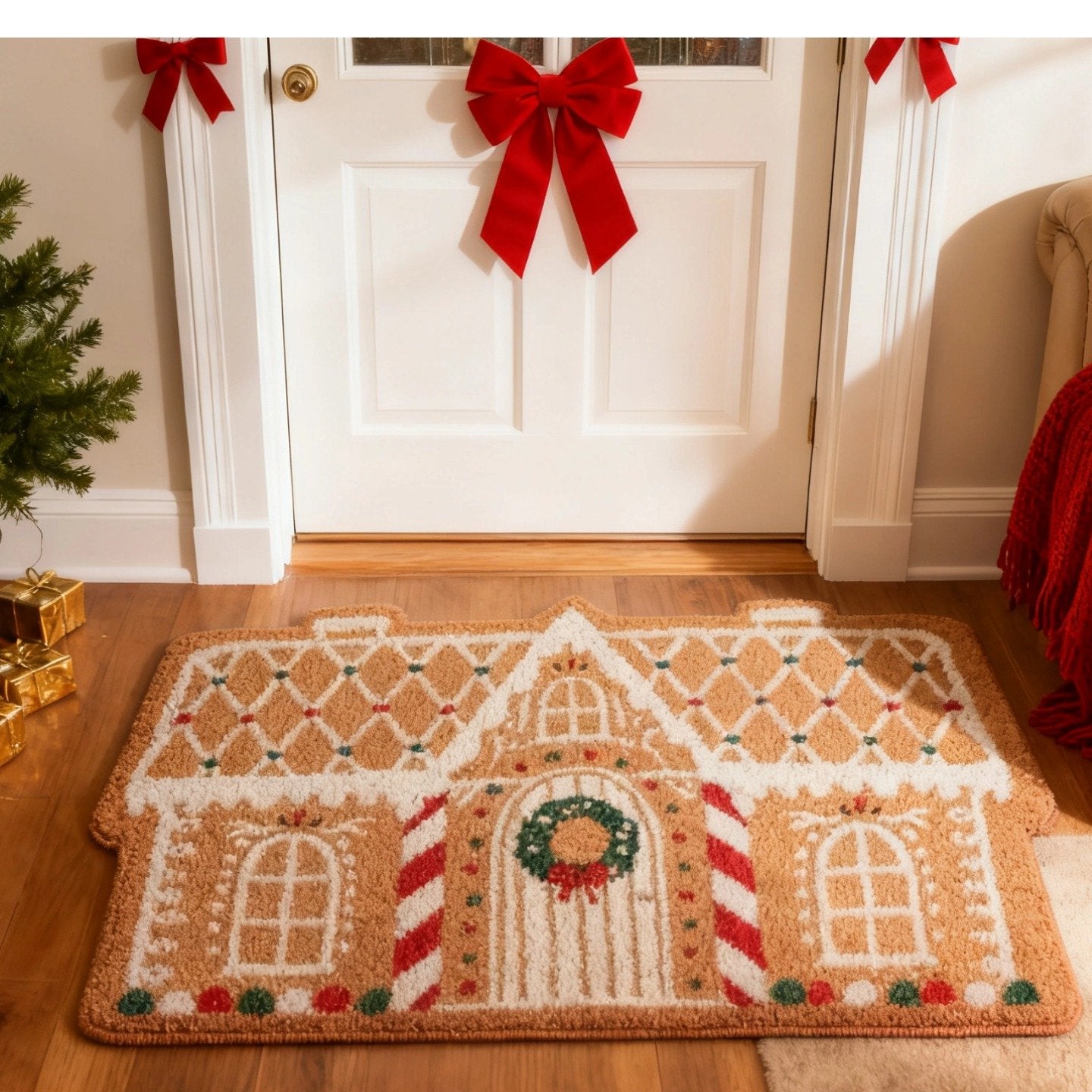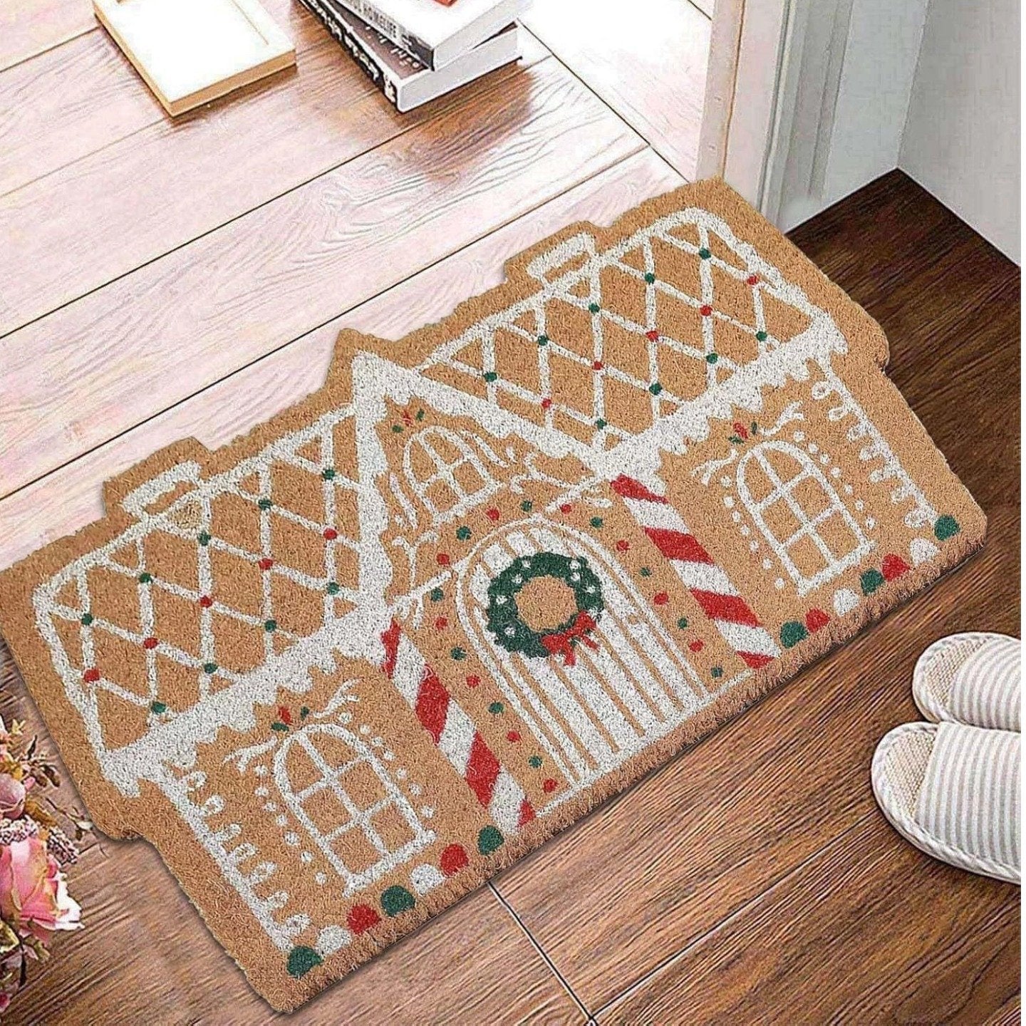 A Christmas cabin door mat adds a warm and festive atmosphere to the entrance of your home.